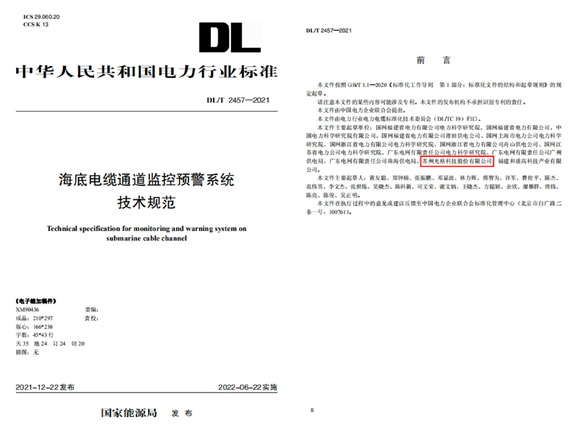 由國家能源局發(fā)布,蘇州光格科技股份有限公司參與主編的《海底電纜通道監控預警系統技術(shù)規范》(DL/T 2457-2021將于2022622日起頒布實(shí)施。